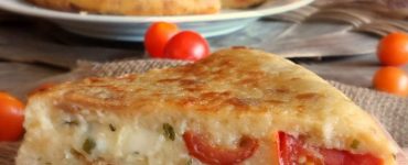 Tarta fără carne din pâine feliată, ou, mozzarella, lapte și roșii cherry