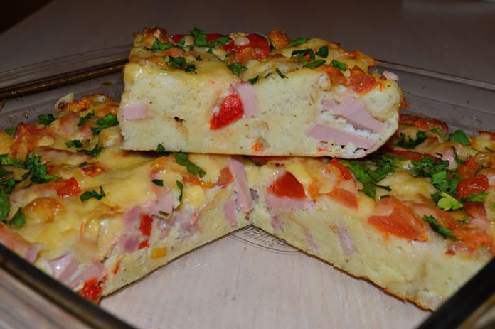 2. Într-un bol separat, batem ouăle. Adăugăm laptele, făina, sarea și condimentele. Amestecăm bine, pe urmă turnăm compoziția peste ingredientele pregătite anterior.
