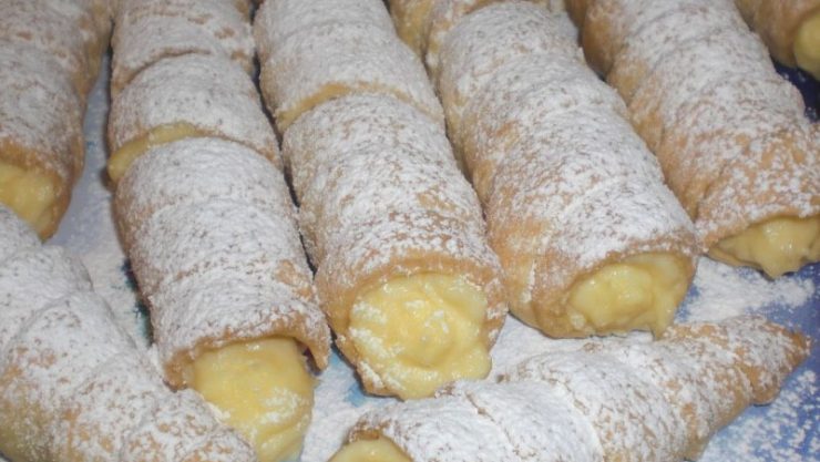 Intinzi din aluat o foaie subtire, din care tai fasii, pe care le rulezi pe forme. Le azezi in tava tapetata si le dai la cuptor sa se rumeneasca usor. Pentru crema, incalzesti laptele, iar cand incepe sa fiarba il dai deoparte.
