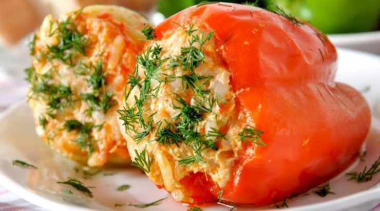 Umple ardeii cu compozitia obtinuta. Nu ii umple foarte mult insa, deoarece orezul va continua sa se umfle la cuptor. Adauga desupra capacele din ardei (pot fi inlocuite cu felii de rosii).